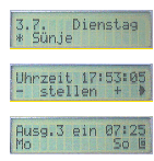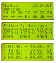 oben: normale Anzeige mit Wochen-Vorschau Mitte: jede Tages-Art hat neun Schaltzeiten. Werktags wird um 6:00 Uhr die Heizung eingeschaltet und um 6:40 das Radio, das um 6:50 wieder ausgeschaltet wird usw. unten: Für Spezialtage können 4 Gültigkeitsbereiche festgelegt werden |