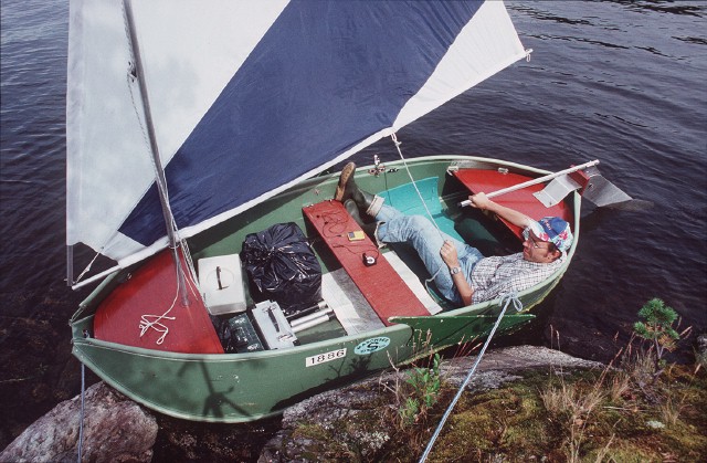 Hier sieht man mich in meinem Banana-Boot mit vollem Gepäck: Zelt, Schlafsack, Lebensmittelkiste, Kühlbox und Fotoausrüstung.