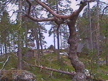Hier steht ein alte, winzige, halb kaputte Blockhütte und daneben wieder eine der schon erwähnten pyramidenförmigen Schutzhütten. Während ich noch mein Gepäck aus dem Boot holte, legte ein Motorboot mit zwei Familien an. Sie hatten ein paar Fische gefangen und benutzten die Feuerstelle, um sie zu grillen und Kaffee zu kochen. Einer der Männer bot mir ein Stück Seeforelle an und sagte, dass er zwei Stunden lang mit ihr gekämpft hatte, bis er sie aus dem Wasser ziehen konnte. (Es schmeckte herrlich, aber angesichts des dafür notwendigen Anglerglücks und der Mühen wird das Angeln trotzdem nicht mein Hobby werden. Da verlasse ich mich doch lieber auf mitgebrachte Konserven, Tütensuppen und Müsli.) Nach dem Essen tuckerten die Leute zurück nach Veskoniemi, und ich war wieder allein. Ich erkundete noch ein wenig die Insel, aber so schöne Fotomotive wie am Vorabend fand ich nicht mehr. |