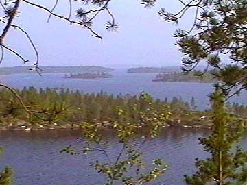 Kurz vorher hatte ich noch einen hohen Felsen gesehen. Er steht etwa einen Kilometer westlich von den Hütten entfernt. Also machte ich mich erst mal auf, um meine Kameraausrüstung dorthin zu schleppen. Es war ein sehr beschwerlicher Weg quer durch den Wald, über Felsbrocken und durch sumpfiges Gelände. Umso ärgerlicher, dass ich mal wieder mein Mückenspray in der Hütte vergessen hatte und mich deshalb nicht allzu sehr entblößen wollte. Als ich dann noch die Felswand hochgestiegen war, war ich schweißgebadet. Aber die Aussicht auf das von der Abendsonne angestrahlte Inselgewirr im Osten entschädigte mich voll für alle Mühen. Ich machte ein paar Aufnahmen, ruhte mich aus und marschierte wieder zurück. Nach einem reichlichen Abendessen legte ich mich dann zur Ruhe.