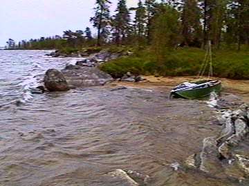 Hier waren zwei Profi-Angler am Werke. Sie besaßen ein großes und ein kleines Motorboot und waren mit mehreren Angeln und Netzen ausgerüstet. In der Schutzhütte (konventionelles Blockhaus mit Telefon) war der Ofen schon angeheizt. Während ich es mir gemütlich machte und mein Abendessen kochte, kamen die Männer herein. Wir wechselten ein paar Worte, dann meinten sie, sie würden in ihrem Boot schlafen, damit ich meine Ruhe hätte. Das fand ich sehr nett, denn ich wollte nach dieser langen Tour ja nicht unbedingt am nächsten Morgen geweckt werden.